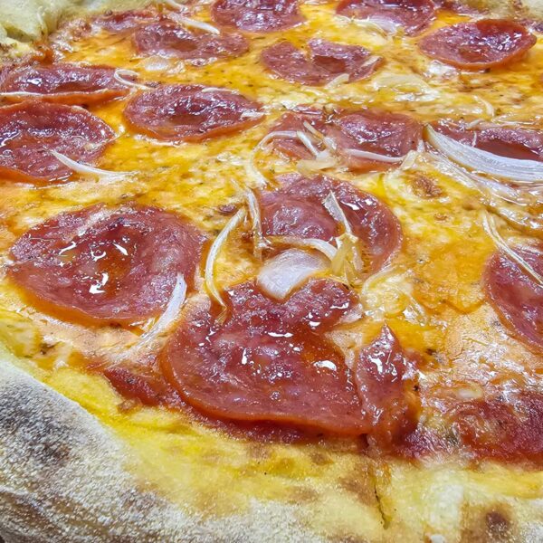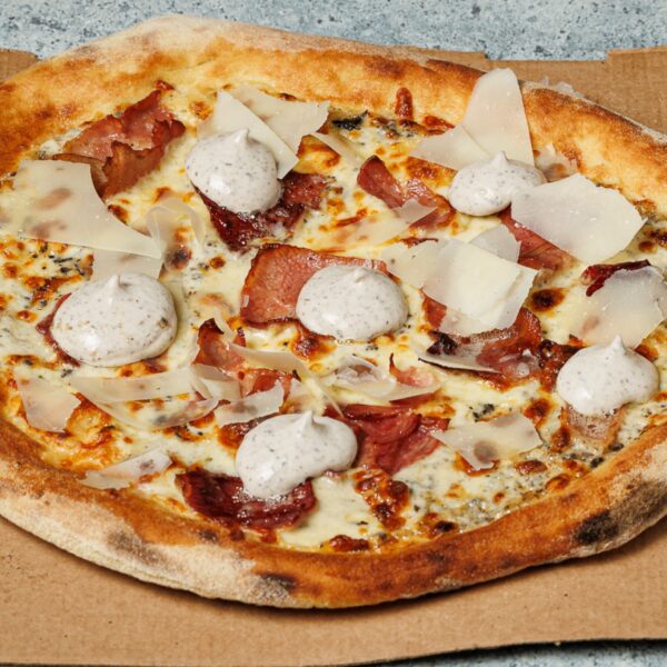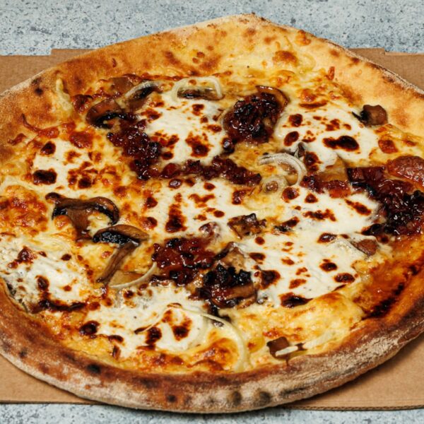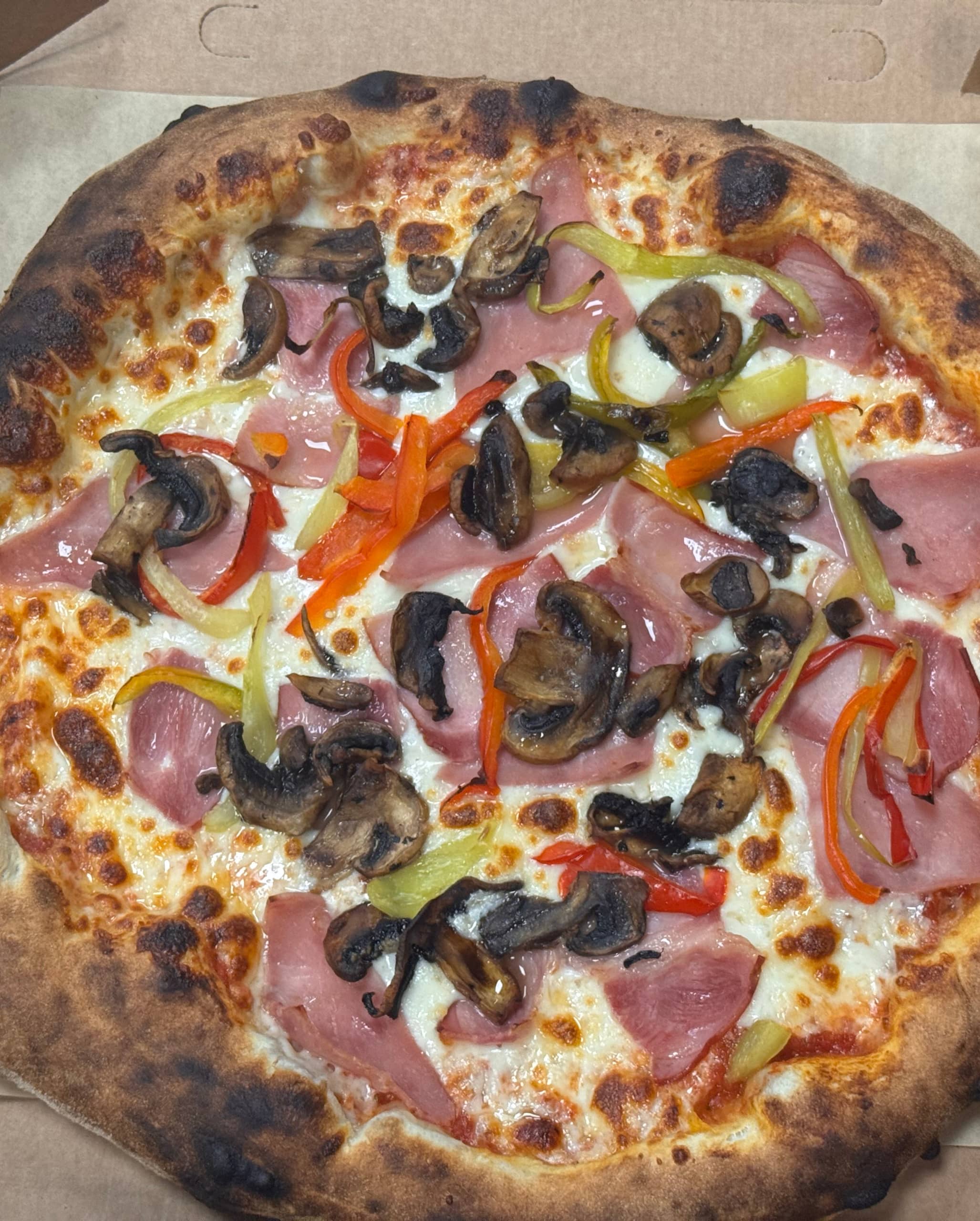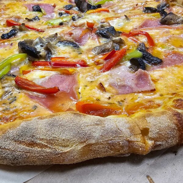 Σάλτσα τομάτας, ζαμπόν, καπνιστό bacon, μανιτάρια, τρίχρωμες πιπεριές.